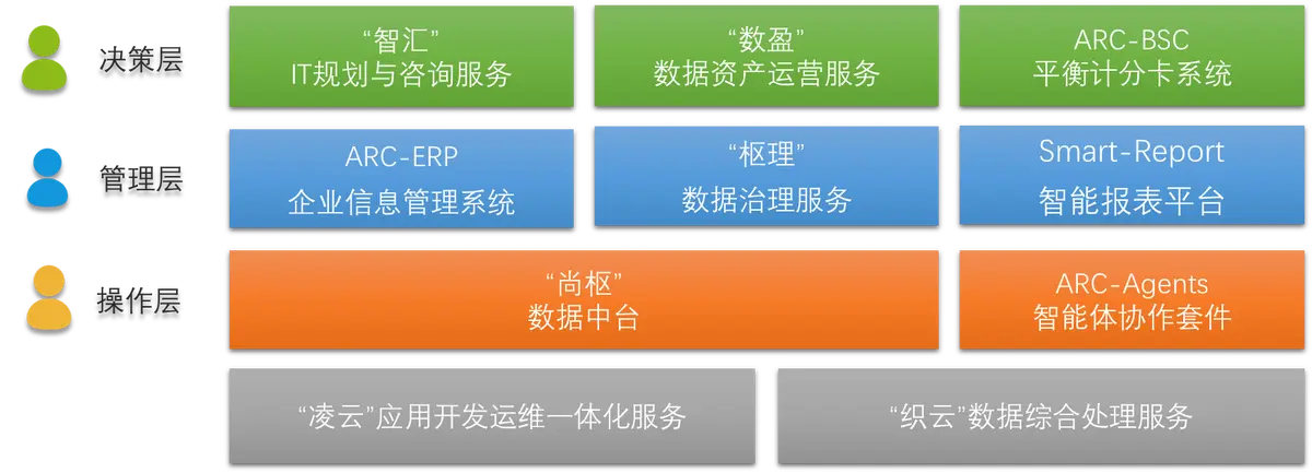決策層,“智匯”IT規劃與咨詢(xún)服務(wù),憑借專(zhuān)業(yè)團隊對行業(yè)趨勢和技術(shù)生態(tài)的深度洞察,為企業(yè)量身定制契合發(fā)展戰略的IT架構藍圖,明晰數字化路徑;“數盈”數據資產(chǎn)運營(yíng)服務(wù),挖掘企業(yè)數據價(jià)值,將分散數據轉化為可運營(yíng)、能創(chuàng )造效益的資產(chǎn),驅動(dòng)業(yè)務(wù)創(chuàng )新;ARC - BSC平衡計分卡系統,以戰略為導向,從財務(wù)、客戶(hù)、內部流程、學(xué)習與成長(cháng)等維度,量化指標、監控進(jìn)度,助力科學(xué)決策 。