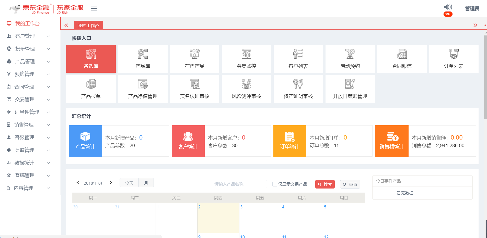 • 我的工作臺:提供系統菜單快捷入口,統計核心業(yè)務(wù)數據及開(kāi)放期內的產(chǎn)品日歷事件展示