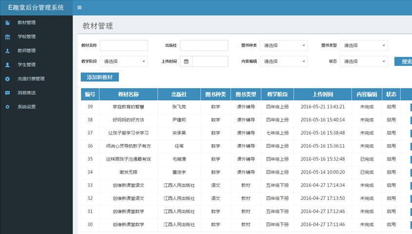 • 教材管理    管理平臺教材信息,采用圖片掃描、上傳、編輯對書(shū)本進(jìn)行錄入
